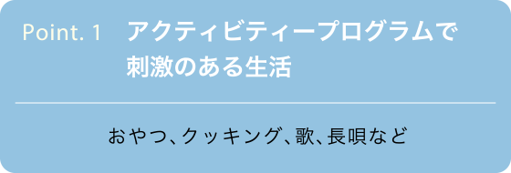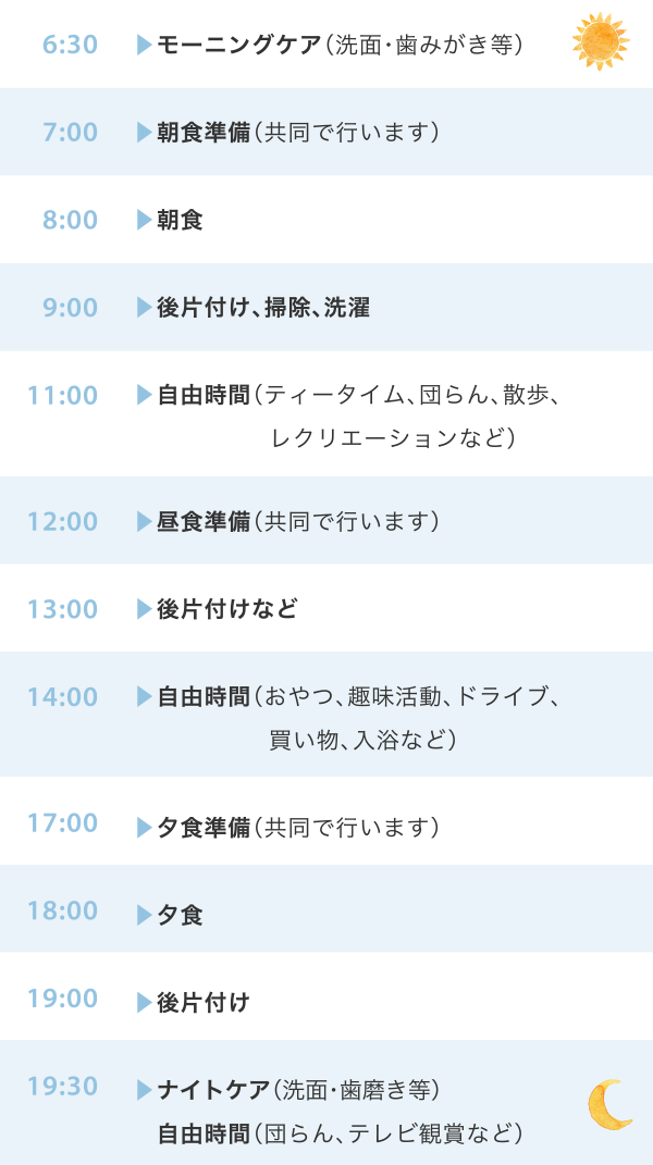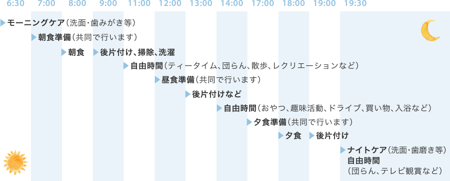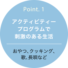 ご入居者の人格やニーズ等に配慮しつつ、自主的・意欲的に日常生活を送ることができるよう、「生活づくり」を支援します。